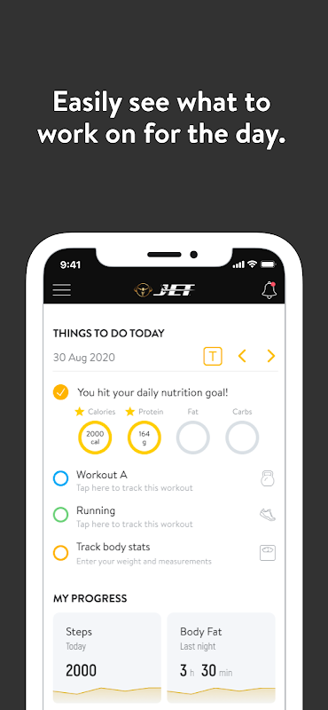 Con la aplicación JET Boston, puede comenzar a realizar un seguimiento de sus entrenamientos y comidas, medir los resultados y lograr sus objetivos de acondicionamiento físico, todo con la ayuda de su entrenador personal.