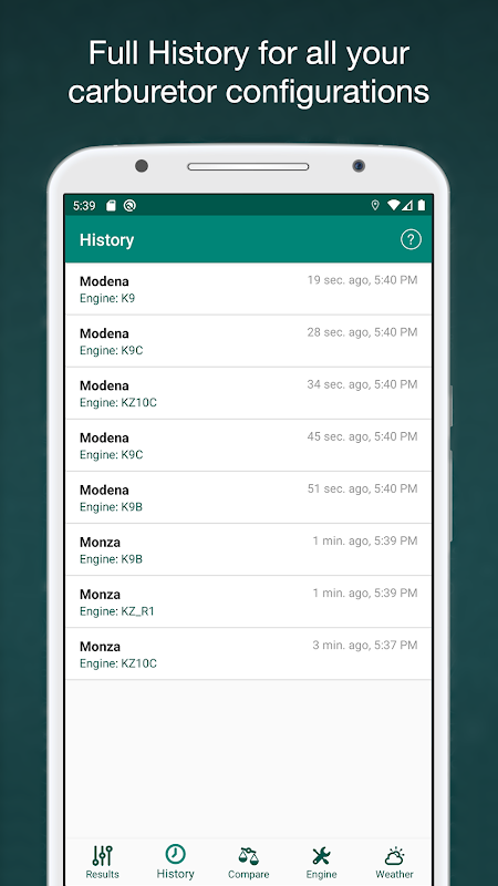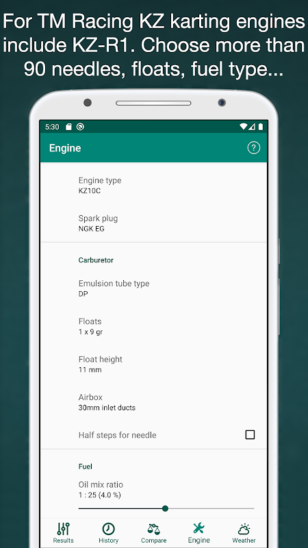 Esta aplicación proporciona, utilizando temperatura, altitud, humedad, presión atmosférica y una configuración de motor determinada (modelo del motor, diámetro del carburador, tipo de tubo de emulsión, flotadores, relación de aceite, tipo de combustible), 12 configuraciones diferentes de carburador para los motores TM K9, K9B, K9C, KZ10, KZ10B, KZ10C, KZ-R1 que tienen Dell Orto VHSH 30 carbs