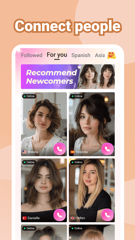 🤝Video chat: puede llamar directamente a sus amigos u otros usuarios en línea para realizar videollamadas.
