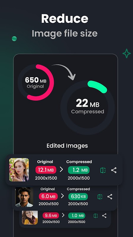 Opciones de conversión de alta calidad:🔄 La aplicación también funciona como un convertidor de fotos profesional: la aplicación JPEG Compressor, que convierte archivos JPEG, PNG, HEIC y WEBP. JPEG Image Converter: Photo Compressor facilita el ahorro de espacio, la conservación de la resolución y la organización de tu biblioteca multimedia con solo pulsar un botón.