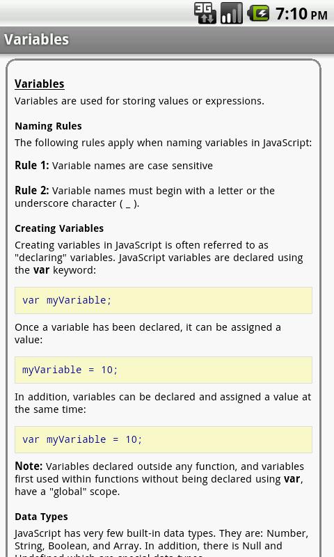 The JavaScript properties/functions/methods are categorized and searchable. Each detailed information screen contains a description, parameters, examples, browser compatibility, and more. In addition, most of the examples include the actual output.