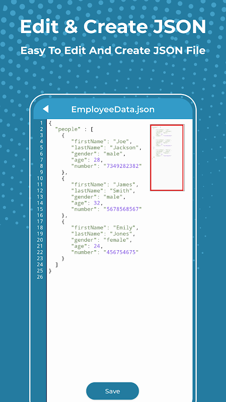 El visor de código JSON también es una herramienta para desarrolladores/herramientas JSON para desarrolladores. La función de creación de JSON de lectura de archivos permite al usuario crear JSON directamente utilizando su teléfono inteligente. Además, la función de selección de archivos de edición JSON permite al usuario elegir fácilmente el archivo JSON de su elección. La función de archivos convertidos de la aplicación de archivos JSON permite al usuario abrir los archivos convertidos en PDF directamente desde la aplicación. Asimismo, la función de archivos recientes del abridor permite al usuario abrir los archivos vistos recientemente sin cerrar la aplicación. Finalmente, la función de archivos guardados de JSON File Opener permite al usuario abrir los archivos guardados directamente desde la aplicación. También podemos decir JSON Formatter, JSON Parser o JSON Validator.