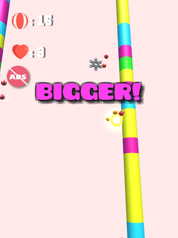 ¡Salta entre dos rodillos y recoge pequeñas bolas para crecer y llegar a la cima! Mientras tanto, trata de que las estrellas ninja no te atrapen. Simplemente toca la pantalla para saltar y toca de nuevo para aguantar. Recuerda, solo puedes aferrarte a las secciones del mismo color que la pelota.