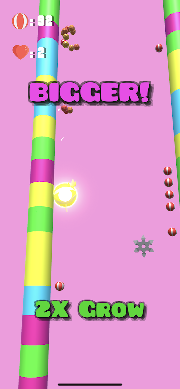 ¡Cuantas más bolas recolectes, más grande serás y cuanto más crezcas, más ladrillos romperás al final del nivel! A veces debes deslizarte hacia abajo por los rodillos para recoger las bolas que te perdiste. Si puedes deslizarte hacia abajo durante mucho tiempo, las bolas que recojas duplicarán tu crecimiento.