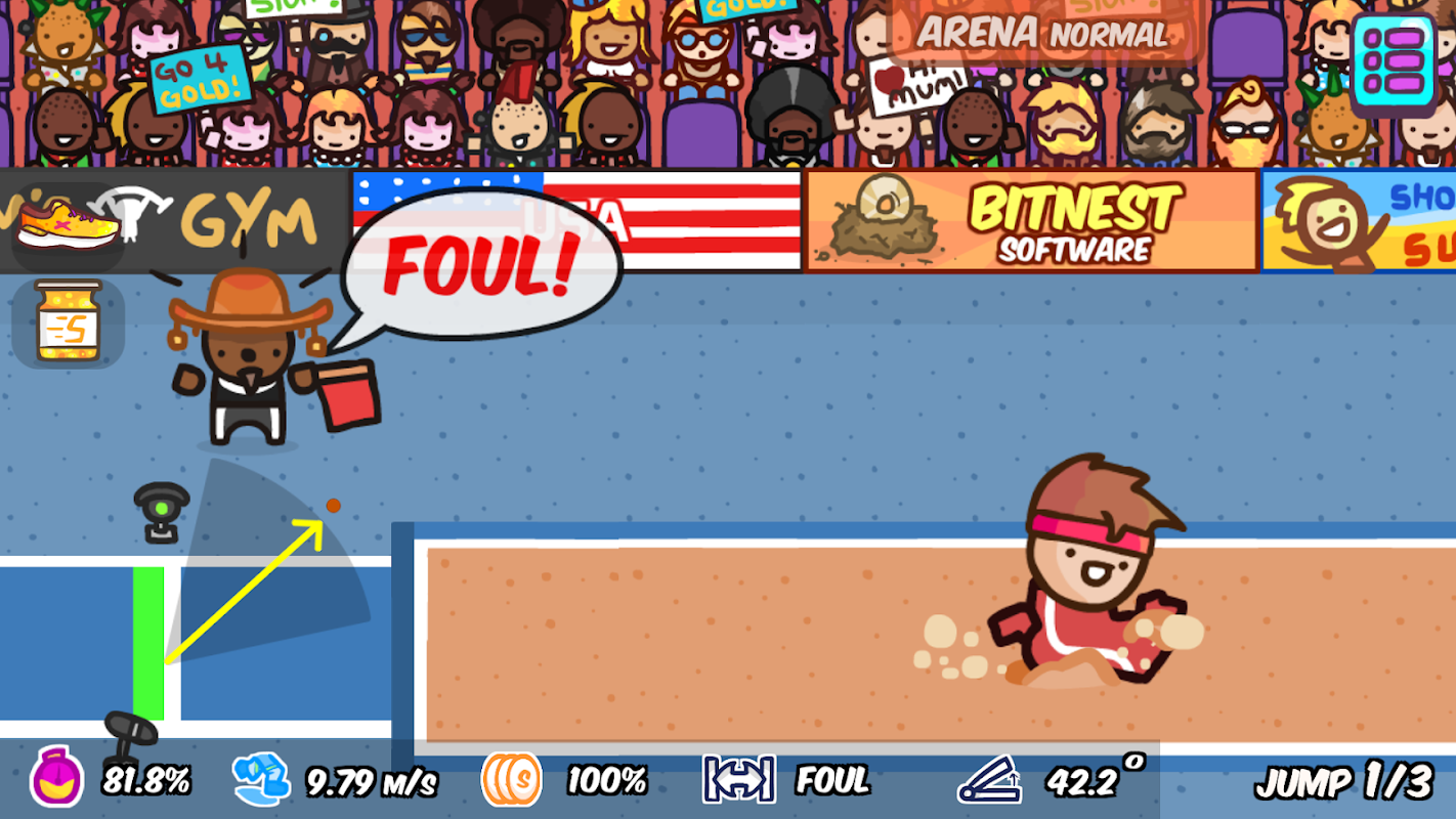 Conviértete en el campeón mundial de salto de longitud en este adictivo juego de atletismo. Compite en la Arena para ganar monedas, consigue mejoras para mejorar tu salto, practica para perfeccionar tus habilidades y asciende en Carrera desde el nivel local hasta el mundial para alcanzar tu objetivo.