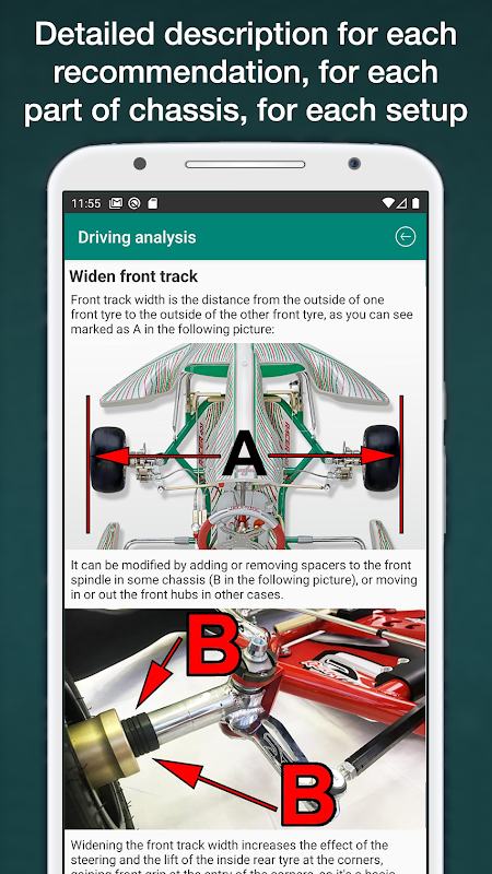 La aplicación es válida para todos los tipos de karts y para todas las clases de karting. Es útil para conductores experimentados o novatos. Para los experimentados, será una segunda opinión sobre lo que está mal con la configuración del chasis, y para los novatos les enseñará los secretos de los ajustes y la configuración del chasis.