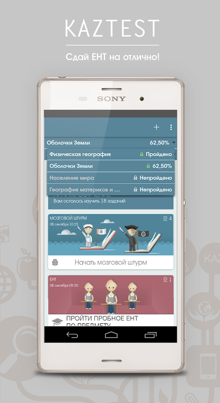 KazTest - мобильное приложение для подготовки к ЕНТ по географии. Представляет собой комплексный подход к методике изучения географии Казахстана. Включает в себя такие функции как