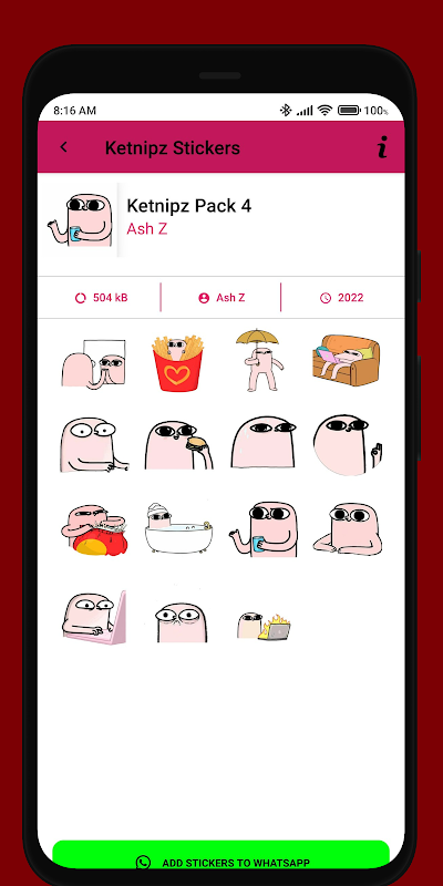 Stickers Ketnipz WASticker, puedes compartirlo con tus amigos. Ketnipz stickers y Love stickers y stickers de buenos días y stickers y stickers de amor y romanticos stickers de buenas noches puedes expresar tu amor a tu amada o ser amado. Las rosas y otras flores encantadoras sorprenderán gratamente a los destinatarios. Los emoji divertidos harán que la conversación amistosa sea más emocionante y los emoticonos animados te harán sonreír. Las pegatinas te ayudarán a expresar tus emociones que son difíciles de expresar verbalmente. Además, actualizaremos constantemente nuevos stickers y GIF. También planeamos diversificar las características de nuestra aplicación en el futuro. No dude en aprovechar estos beneficios de nuestra aplicación ahora.