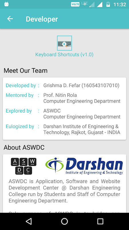 Esta aplicación está desarrollada en ASWDC por Grishma Fefar (160543107010), un estudiante de 5th Sem CE. ASWDC es el Centro de desarrollo de aplicaciones, software y sitios web de la Universidad de Darshan, Rajkot, dirigido por estudiantes y personal del Departamento de Ingeniería y Ciencias de la Computación.