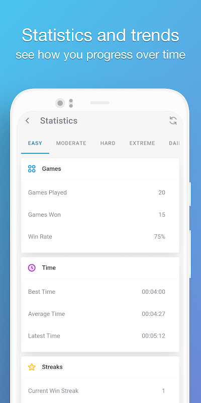 • Estadísticas para seguir tu progreso en cada nivel de dificultad: analiza tus mejores tiempos, tus rachas y mucho más