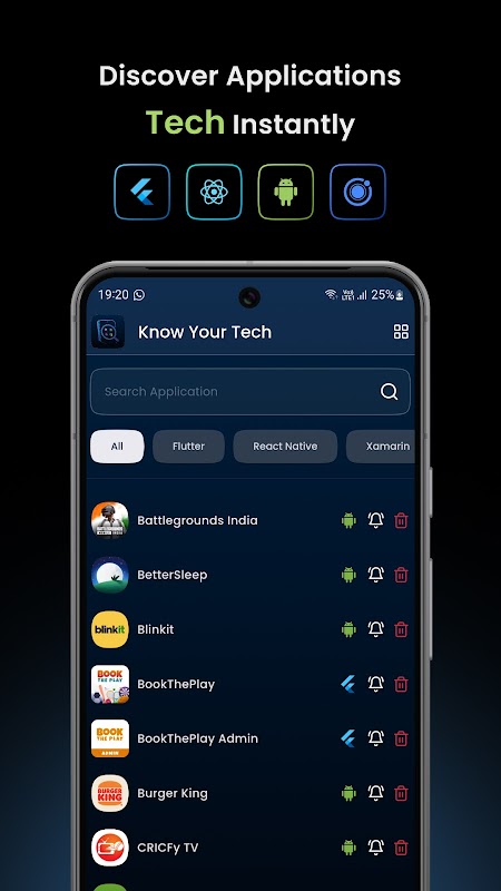 ¿Alguna vez te has preguntado qué impulsa las aplicaciones de tu teléfono? Conoce tu Tecnología es la herramienta definitiva para entusiastas de la tecnología, desarrolladores y mentes curiosas. Descubre al instante los frameworks, lenguajes de programación y herramientas que hay detrás de tus aplicaciones instaladas, incluyendo Flutter, React Native, Xamarin, Ionic y Android nativo.