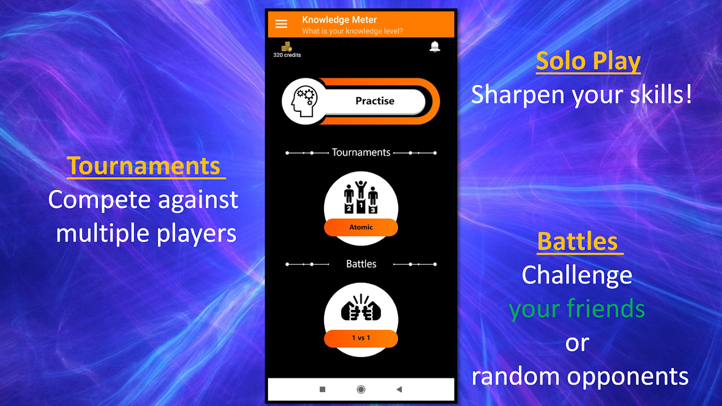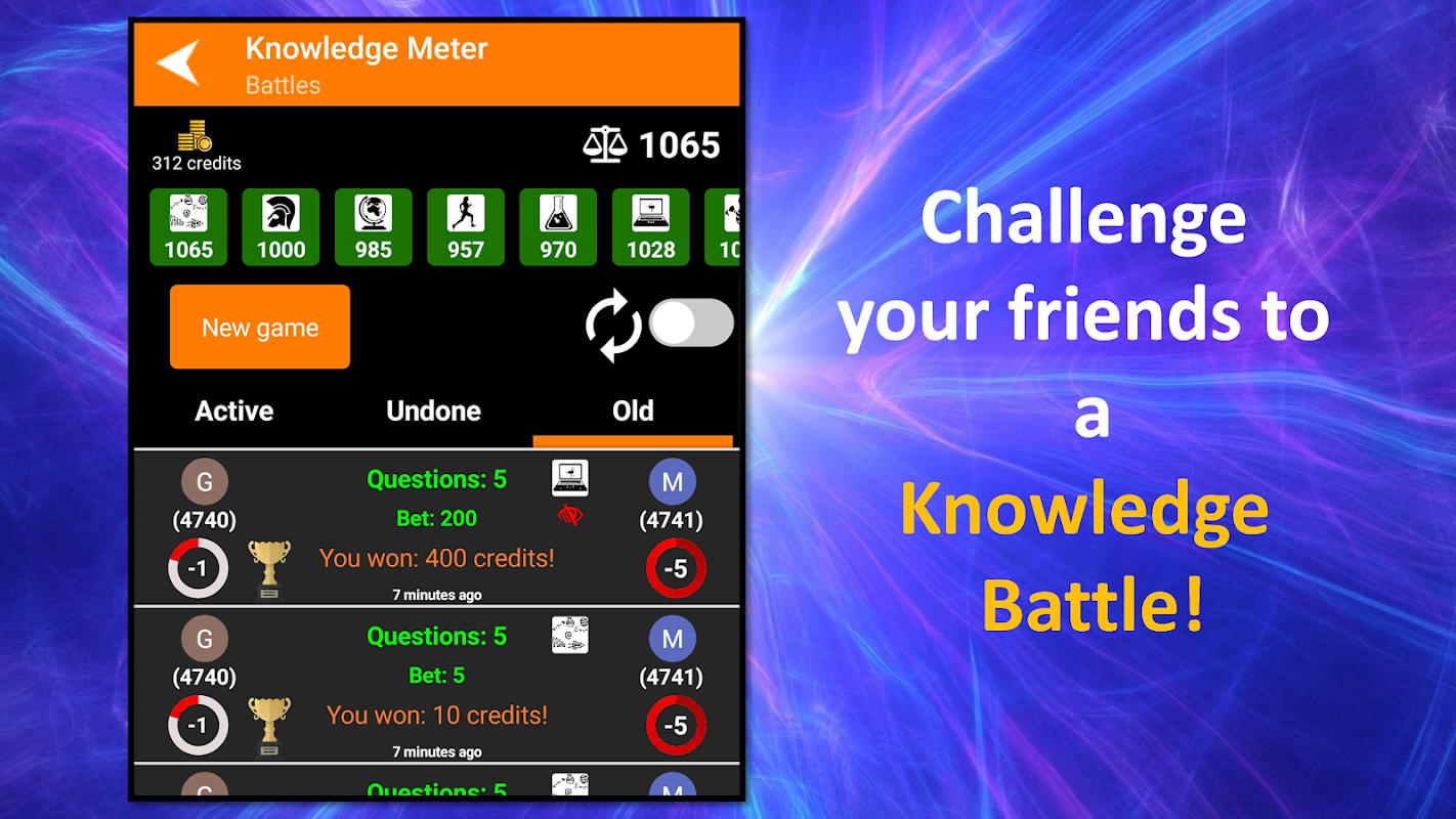 ¿Te gustan los juegos de trivia? ¿Eres un maestro de los concursos? ¡Knowledge Meter es la mejor aplicación de preguntas y respuestas donde puedes poner a prueba tus conocimientos, desafiar a tus amigos y competir en emocionantes batallas de preguntas, torneos y modo de práctica!