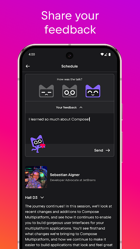 La aplicación oficial KotlinConf 2025 le brinda acceso completo al calendario de la conferencia: busque sesiones, filtre por etiquetas, marque sus favoritos y reciba notificaciones antes de que comiencen. También puede votar y compartir comentarios sobre las sesiones y recibir actualizaciones en tiempo real de los organizadores para no perderse nada durante el evento.