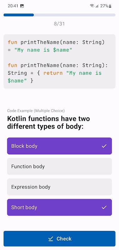 Aprenda el desarrollo de Kotlin (Android, Compose, KMP) con cuestionarios especialmente diseñados.