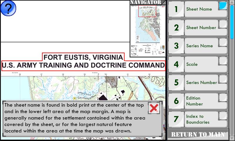 The Land Navigation app is a training guide that instructs the soldier on the basics of map reading, point plotting, and compass usage, and a challenge that presents the soldier with six points that they must plot on a 2D map, and then they are put in a 3D environment where they must navigate to the plotted points.