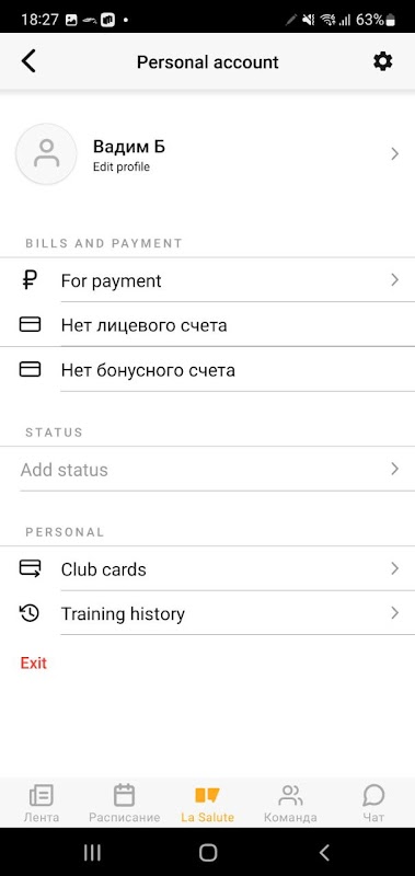 Aplicación móvil para miembros del gimnasio LaSalute en Zemlyanoy Val en Moscú. En la aplicación el usuario puede consultar el calendario de entrenamientos, noticias, entrenadores del club, etc.