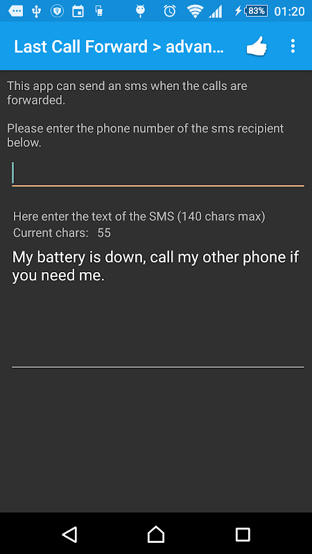Forward your calls when your battery is discharged. Last Call Forward monitors your battery level, and if it drops bellow the defined level, it'll forward your calls to your second phone. Ideal for people with busy schedules that are constantly on the move or for people that forget to charge their phone.