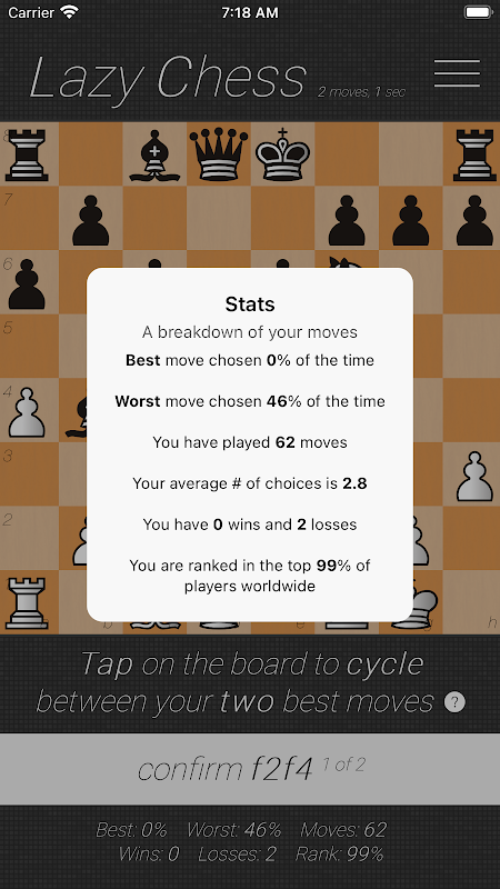 Lazy Chess es un juego gratuito y sin fines de lucro, creado tanto para jugadores ocasionales como para aficionados. En él, los jugadores, en el peor de los casos, realizan la segunda mejor jugada disponible. De media, hay más de 30 movimientos legales disponibles por turno, lo que crea un sinfín de posibilidades a lo largo de la partida. Lazy Chess lo reduce todo al permitirte elegir solo dos en cada turno, seleccionados por Stockfish, el motor de ajedrez más robusto del mundo. ¿La clave? ¡No sabrás cuál es el mejor movimiento!