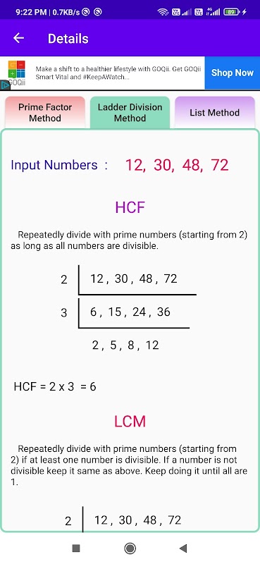 Esta es una aplicación de calculadora simple de LCM y HCF (GCF / GCD). Toma la entrada de hasta 9 números. Muestra detalles de la solución paso a paso de cada problema. Esta aplicación muestra la solución en tres métodos: método de factor principal, método de división de escalera, método de lista.