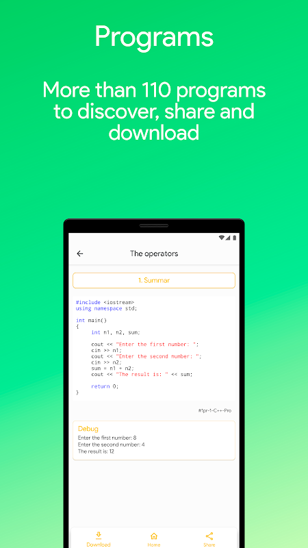 La aplicación tiene una interfaz muy sencilla y puede ser utilizada por todo el mundo. Aprender C++ PRO está fuera de línea y se puede utilizar en cualquier momento y lugar. Está especialmente recomendado para aquellos que quieren aprender C++ pero también para aquellos que quieren profundizar o repasarlo.