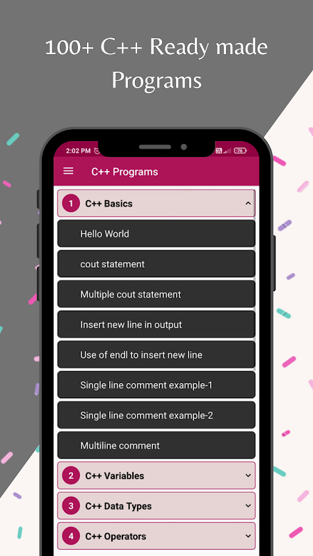 ¿Aprender C? ¡Domina C++! Esta aplicación gratuita todo en uno es tu guía perfecta para aprender C++ y construye una base sólida incluso si recién estás comenzando con C. Aprenda conceptos de C++ a través de explicaciones claras y ejemplos prácticos, completos con resultados interactivos para ver su código en acción.
