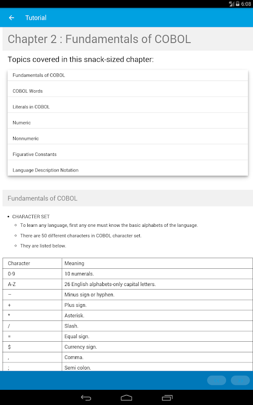 You have limited access to the content provided. For full access to the content, please login and purchase this application. This app provides a quick summary of essential concepts in COBOL Programming by following snack sized chapters: