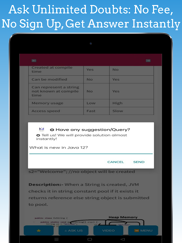 ¡Bienvenido a nuestra aplicación Tutorial de Java! Nuestra aplicación es una ventanilla única para todas sus necesidades de programación Java. Con acceso 100% gratuito de por vida, puedes aprender a programar en Java a tu propio ritmo, sin gastar un centavo. Nuestra aplicación está diseñada para hacer que el aprendizaje sea fácil y divertido, para que puedas convertirte en un experto en poco tiempo. Una de las características únicas de nuestra aplicación es que no es necesario registrarse para acceder al contenido. Simplemente descarga la aplicación y comienza a aprender. Tendrás acceso a 25 horas de contenido, con acceso ilimitado a la teoría y la posibilidad de hacer preguntas ilimitadas.