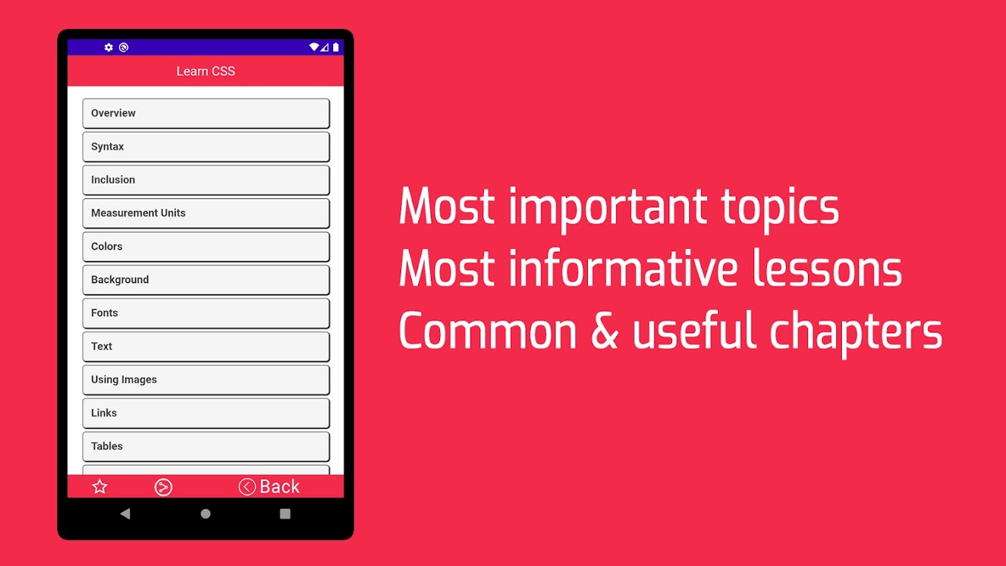 Learn CSS Tutorial Offline app is essential for designers and developers. This app will give you most common & useful chapters. This app will provide you example and explanation. So now you can carry your basic css tutorial book offline app and learn from it anywhere anytime.