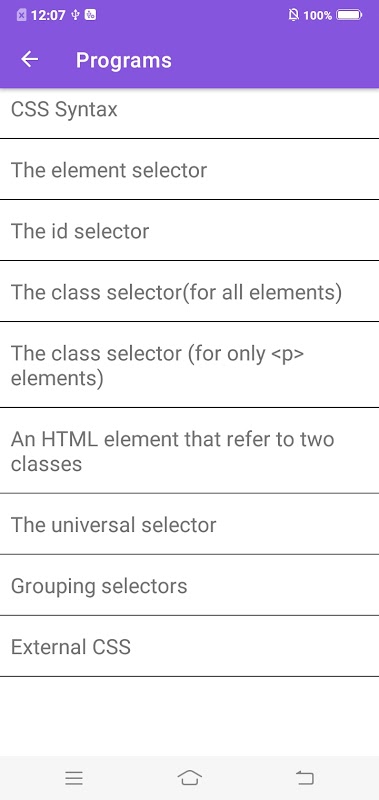 With an amazing collection of CSS Programs (code examples) with comments, multiple questions and answers, all your programming learning needs are bundled in a single code learning app.