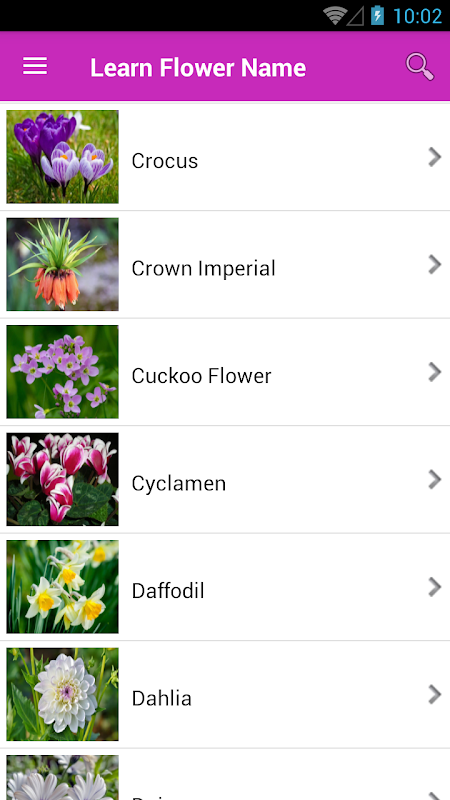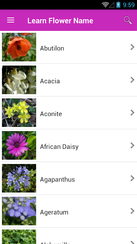 La aplicación Learn Flower Name es fácil de usar, puede hacer fovoritas de flores y buscar flores por su nombre.