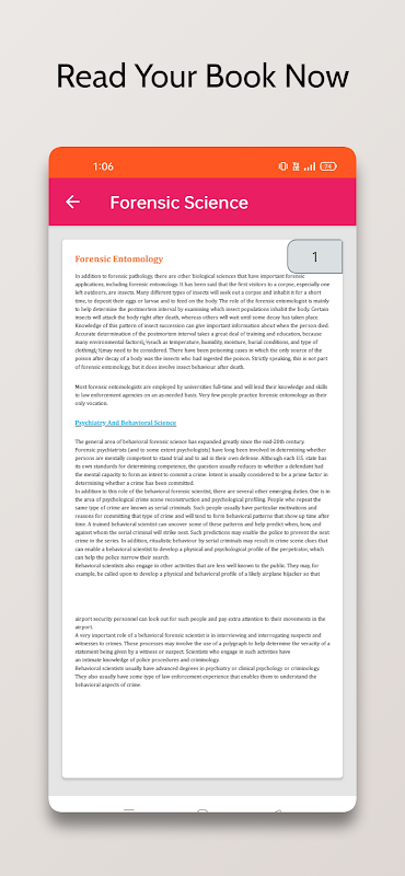 Los ratones de biblioteca necesitan libros cada vez que pueden ser educativos, ficticios, sensacionalistas, de ciencia ficción, románticos, de comedia, cualquier tipo de libro. La ciencia forense es un libro educativo como categoría. La serie de libros educativos de los desarrolladores puede ser útil y fructífera para el estudiantes y profesores Hoy en día, la mayoría de los libros educativos pueden costar mucho dinero. Esta aplicación puede proporcionar libros gratuitos con información precisa. Leer esta aplicación de libros ayudará a muchos estudiantes que no pueden tener una educación adecuada por falta de libros y material de estudio.