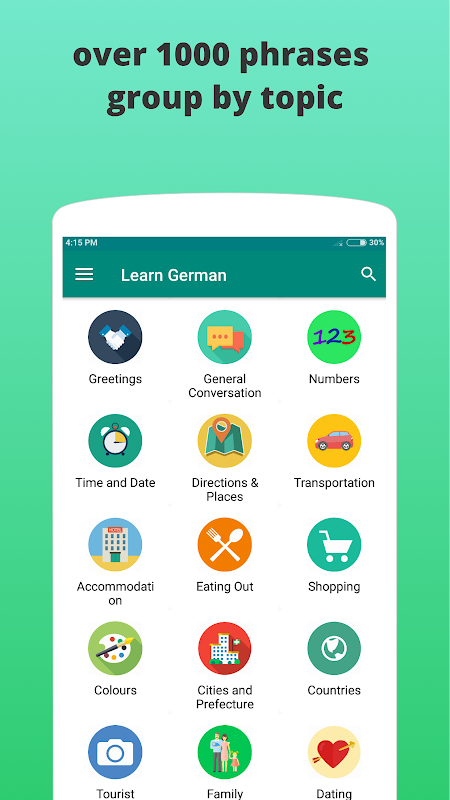 Aprender alemán - Deutsch Lerne contiene más de 2000 frases alemanas de uso común y vocabularios para los viajeros y los principiantes en 18 categorías.