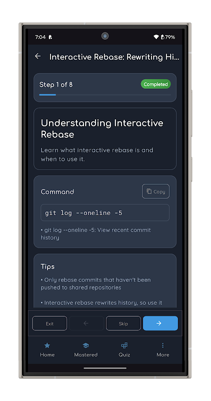 ¡Domina los comandos de Git con tutoriales interactivos, cuestionarios y aprendizaje gamificado!