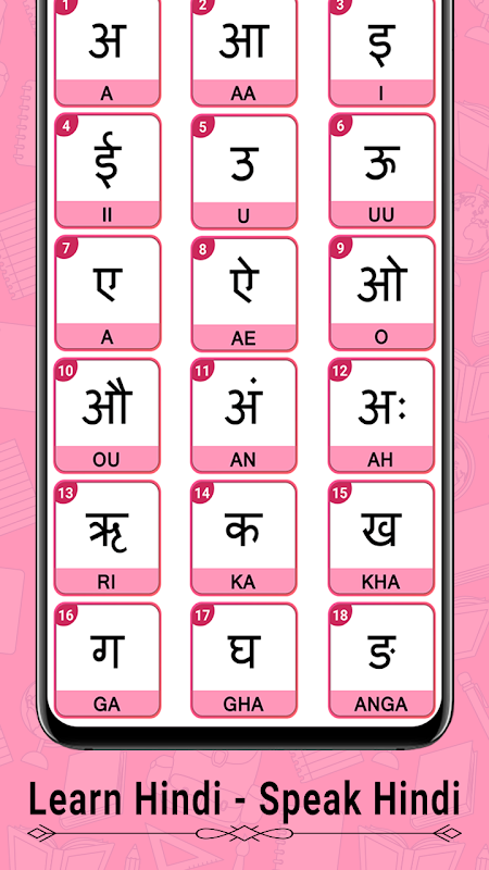 Learn Hindi - Speak Hindi Provide alphabets with English translation, Just tap on any alphabet it will speak and anyone can understand it easily. Take the first step to learn Alphabets and try all methods to speak and learn Hindi fast. App has a clear UI design with anyone who can use it easily.