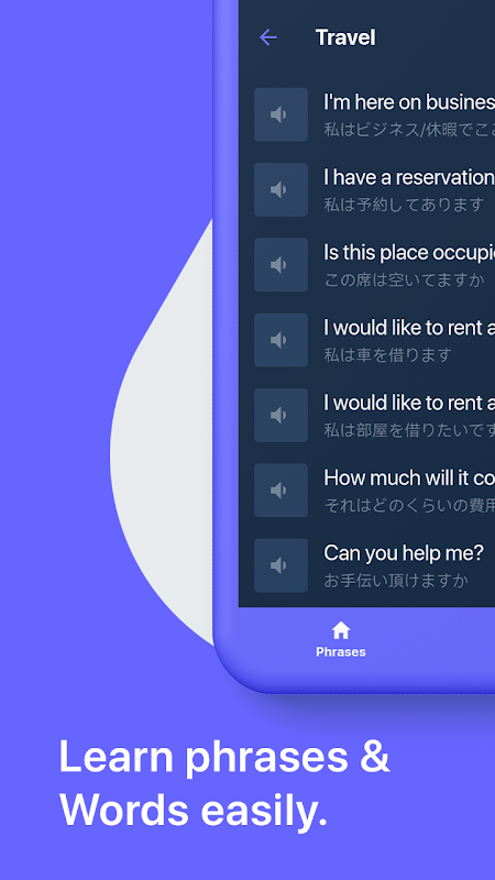 Aprende japonés sin conexión: habla con fluidez: es una aplicación de Android para aprender frases y palabras japonesas de varias categorías y de varios idiomas base.