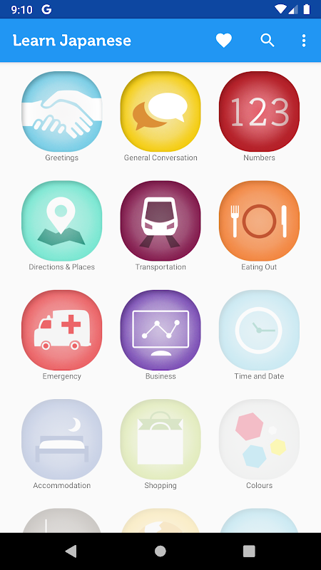 Learn Japanese contiene aproximadamente 400 frases esenciales en 6 categorías