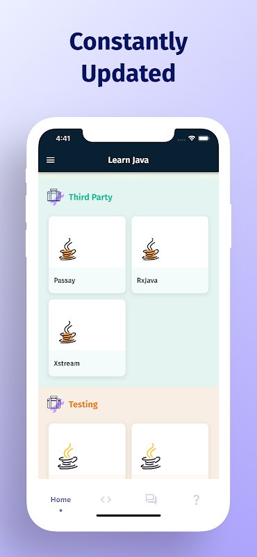 Esta aplicación contiene todos los principales temas básicos y avanzados de la programación Java con excelentes ejemplos de código y programas Java. Esta aplicación cubre todas las tecnologías Java en detalle. Con su hermosa interfaz de usuario y sencillos tutoriales de Java, puede aprender a programar en Java en unos pocos días. Actualizamos constantemente esta aplicación con cada nueva versión importante de Java y otros marcos y agregamos más ejemplos de código y proyectos de Java.