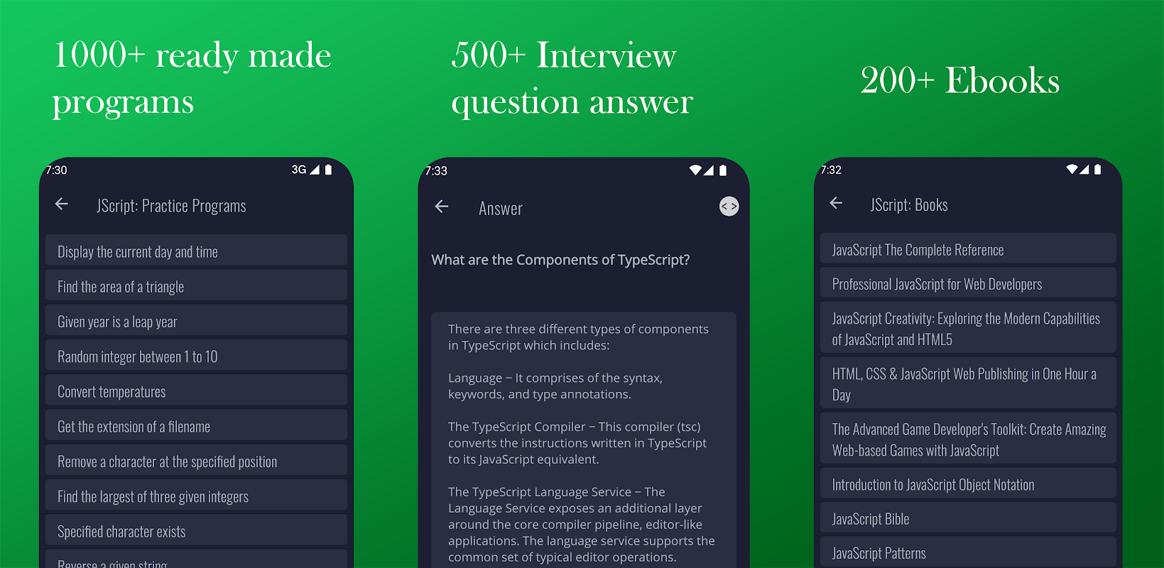 This amazing JScript: Learn JavaScript Learning app has amazing content such as JavaScript Programming Tutorials, JavaScript Programming Lessons, Practice Programs, Quizzes, Questions & Answers, and all that you need to either learn JavaScript programming basics or to become a JavaScript programming expert.