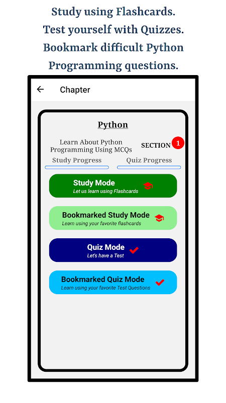 Esta aplicación es un excelente recurso para aprender sobre el lenguaje de programación Python. La aplicación está diseñada para que los usuarios comprendan perfectamente las preguntas comunes del lenguaje de programación Python al estudiar durante un período de tiempo muy corto. La funcionalidad de audio y los marcadores están disponibles en toda la aplicación en los modos de capítulo, sección, estudio y prueba.