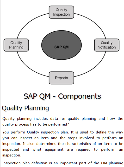 SAP QM Tutorial for Beginners - Learn SAP QM in simple and easy steps starting from basic to advanced concepts with examples including Overview, Components, Integration, Master Data, Inspection Methods, Plan, Sampling, Quality Info Records, Lot, In-Process, Final Inspection, Result, Defects Recording, Usage Decision, Listing Inspection Lot, Quality Notification, Benefits, Tables, Consultant Responsibilities.