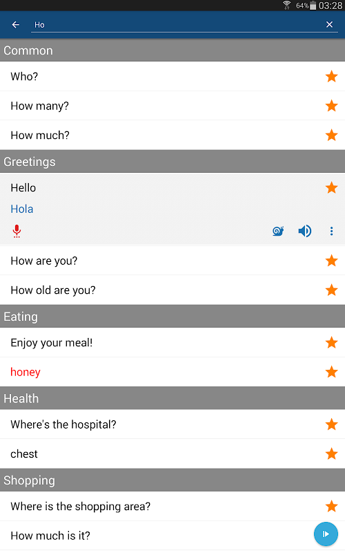 La aplicación de “Aprenda Español” tiene muchas palabras y frases útiles en español (p.ej., “¡Gracias!”, “¿Cuánto cuesta?” o “¡Una mesa para dos, por favor!”). Al tocar una frase, la aplicación la dice en voz alta. No tendrá que adivinar cómo decir las palabras. Y si considera que la aplicación está hablando demasiado rápido, Simplemente toque el icono del caracol para escuchar las palabras más lentamente. Escuche la grabación de la pronunciación de un hablante nativo de español, ¡y posteriormente grabe y reproduzca su propia voz para mejorar su habilidad de hablar español!