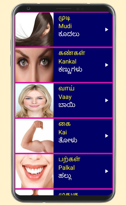 2. Cada palabra tamil tiene una imagen clara 📸🖼️ y una pronunciación de audio 🎵🔊 para facilitar el aprendizaje de Tamil a través de Kannada.