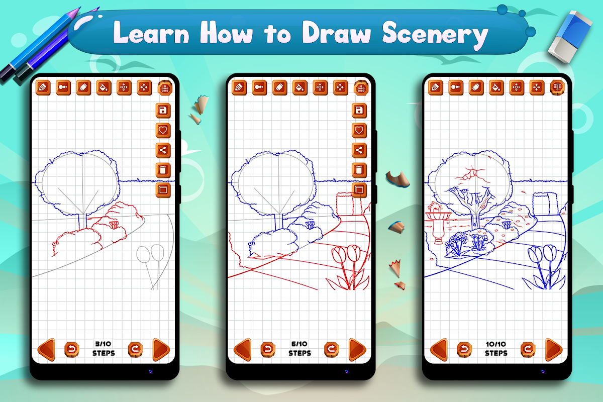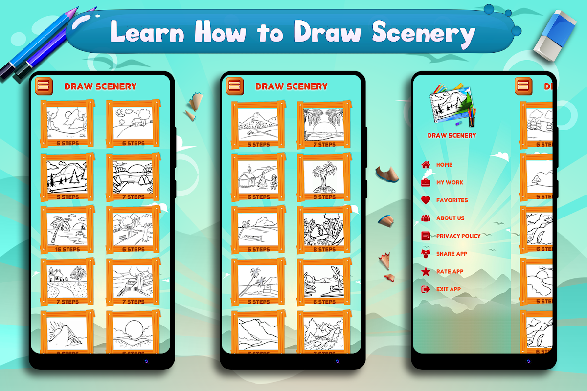 No necesita ninguna habilidad especial, solo comience a dibujar, sea creativo e impresione a sus amigos y familiares con sus increíbles habilidades con esta aplicación gratuita de Learn Learn To Draw Scenery & Landscapes.