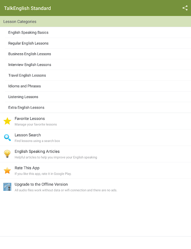 TalkEnglish estándar es la aplicación Android gratis de TalkEnglish.com. Hay más de 900 lecciones y 8,000 archivos de audio para ayudarte a aprender cómo hablar Inglés fluidamente. La mayoría de las lecciones contienen oraciones interactivas en las que puedes hacer clic para escuchar a un hablante natural de Inglés decir la oración. Cada página de lección también tiene una herramienta de autograbación. Puedes grabar tu propia voz leyendo la oración y compararla con el archivo de audio del hablante natural de Inglés.