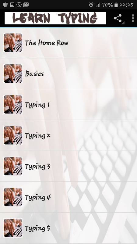 ❈ Si te gusta nuestra aplicación, por favor nos da una calificación de cinco estrellas ✫✫✫✫✫, o dicho de sus valiosas sugerencias, vamos a tratar de hacerlo mejor. -------------------------------------------------- ----------- aprender mecanografía al se prepara con usted en mente. Aprender mecanografía es un tutorial de aplicación de mecanografía libre. Nuestras lecciones de mecanografía libres han sido preparados para personas de todas las edades, experiencias y habilidades para aprender a escribir. Si usted está buscando una prueba de mecanografía libre, tenemos más de uno para elegir. Llegar a conocer cómo aprender mecanografía al tacto y empezar a escribir más rápido. Sentado postura, posición de la fila en casa y los dedos de movimiento, consejos para el teclado, el proceso de aprendizaje y más ... ❈ se puede compartir en Instagram, Snapchat, Twitter, Facebook, Messenger y iMessage! Aprenderá a escribir .... GRATIS! Mejorar la velocidad, la precisión, la confianza para la educación, el trabajo y el hogar. Nuestra aplicación le enseñará a tipo como un profesional y alcanzar su máximo potencial. ✘ licencia gratuita para uso comercial y personal ✘