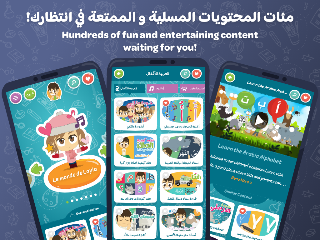 Nuestra aplicación contiene cientos de contenidos que hacen reír, sonreír y aprender al mismo tiempo a los niños, cada una de las letras, ... los colores, formas, nombres de animales ... frutas y verduras y muchas otras cosas, en árabe, inglés e incluso francés