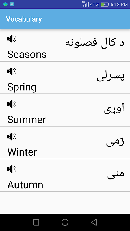 Esta aplicación permite al usuario de entender y hablar el idioma pashto.