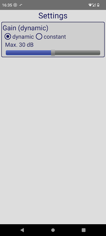 El sonido fuerte y/o la exposición prolongada a un sonido fuerte puede causar daños permanentes en los oídos, los auriculares y/o el altavoz del dispositivo. Configure el volumen de audio de su dispositivo a un nivel seguro que no sea demasiado alto. En la configuración de la aplicación hay dos opciones: ganancia dinámica y ganancia constante. Si elige ganancia constante y escucha un sonido distorsionado, asegúrese de reducir el nivel de amplificación (dB) con el control deslizante. Cuando utilice auriculares, es posible que no pueda percibir los sonidos del entorno. Asegúrate de que esta aplicación no te distraiga de los sonidos importantes que te rodean.