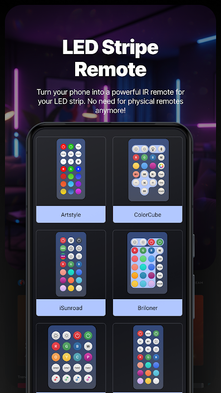 Controla tus luces RGB con tu smartphone con esta sencilla y potente app. Diseñada para teléfonos con infrarrojos, te permite gestionar luces RGB, ajustar el brillo, cambiar colores e incluso reemplazar un controlador LED RGB Bluetooth o un control remoto LED tradicional perdido. Tanto si buscas una app RGB para controlar tu controlador de luces RGB como para gestionar el control remoto de tu bombilla RGB, esta app te lo ofrece. Con una interfaz intuitiva y modo nocturno, puedes controlar cómodamente tus tiras de luces LED, lámparas u otros dispositivos de control RGB.