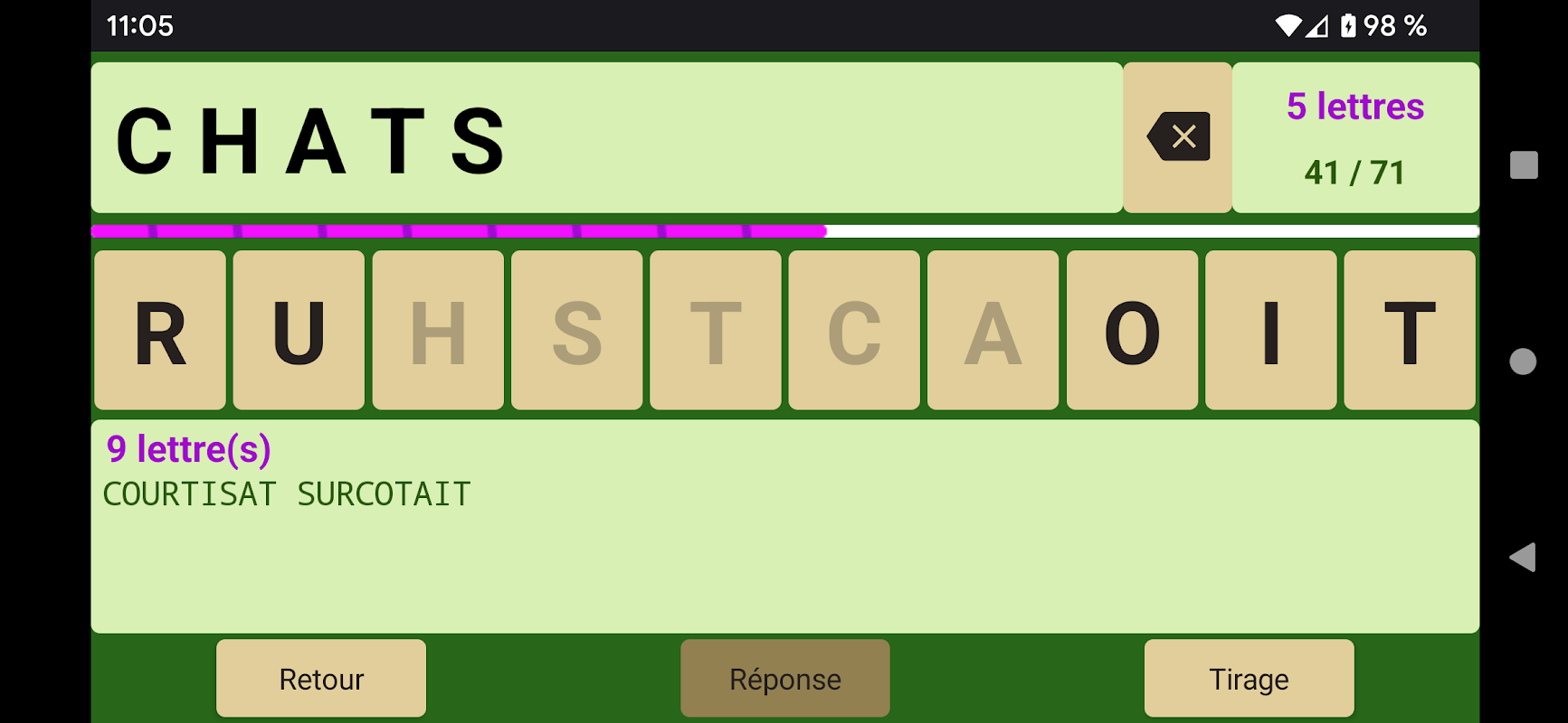 El objetivo del juego es encontrar la palabra más larga de 10 letras extraídas al azar. Se aceptan verbos conjugados.